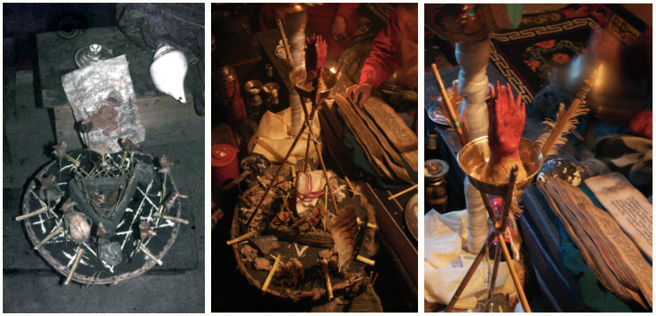 Lama Tshultrim and his assistants began making tormas at 17.30 in the shrine room (mchod khang), the room in which the ritual was to be performed. Tshultrim and Norbu proceeded to make the “nine wooden firebrands” (shing ’gal ba dgu) from the barberry wood, while Yungdrung Phuntshog concentrated on making the tormas. The explanation Tshultrim gave concerning the function of the firebrands was not clear, but the term features in most Bonpo and Buddhist texts relating to the vampire-subjugation ritual without any proper explanation. According to John Bellezza (Zhang zhung) the term denotes the nine types of wood to be used in cremations, but he does not appear to cite a particular source for this assertion.1 Firebrands incidentally play an important part in exorcistic rituals among the Gurungs of Nepal.2